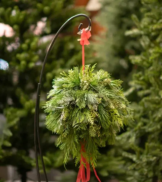 Create a festive hanging arrangement filled with fragrant evergreens, festive berries, and a touch of ribbon.