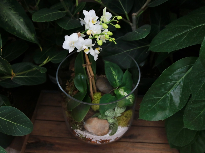 Layer the orchid with a tropical plant, decorative mosses, and natural bark to build a stunning still-life that blends texture and bloom.