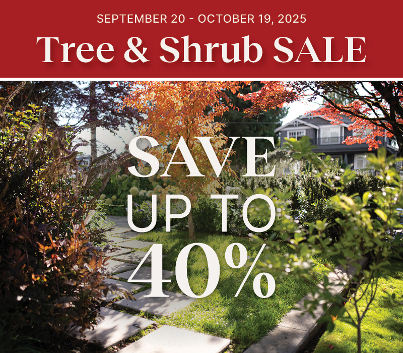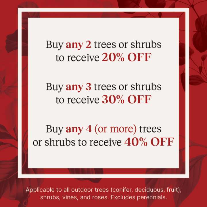 Tree & Shrub SALE in effect September 20 - October 19, 2025. Applicable to all outdoor trees (conifer, deciduous, fruit), shrubs, vines, and roses. Excludes perennials.