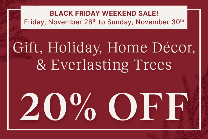20% OFF all Gift, Holiday, Home Décor, and Everlasting Trees/Wreaths/Garlands. Sale price in effect Friday, November 28 to Sunday, November 30, 2025.