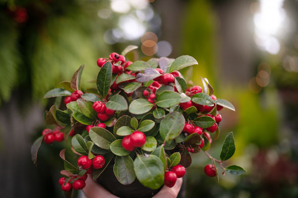A low, slowly spreading broadleaved evergreen, with glossy green leaves. Related to our West Coast native salal, wintergreen thrives in similar conditions, best in a partially shaded location and an acidic, moist but well drained soil. White bell shaped flowers and red berries often appear on the plant at the same time in late summer and fall, and berries remain on the plant well into the new year. Very popular in winter containers, as a single plant in a relatively small 11cm pot may have as many as 50 or more berries. The variety “Peppermint Pearl” features white berries (often with a slight pink hue to them).