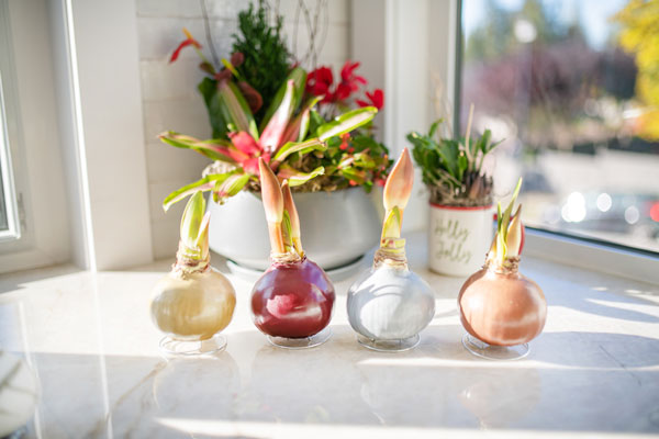 Something a bit new on the scene are waxed amaryllis. These are amaryllis that have been coated in decorative coloured wax which means they don’t need soil or water to bloom. There is literally no care involved, just place it on a flat surface away from any extremes of heat or cold. These free-standing bulbs can be placed anywhere, display it on your desk, tuck it into a holiday display, get creative and enjoy the stunning show.
