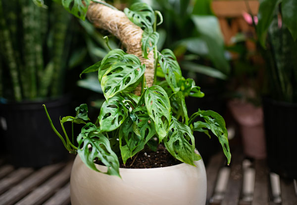 6. Swiss cheese plant looks exactly like what you’d expect, leaves that are full of decorative cut-outs. This dark green coloured vine (monstera adansonii) is perfect for a shady corner, put it in a macrame hanger or a wall sconce and allow it to cascade. Make sure to clip it back to keep it looking neat and compact.
